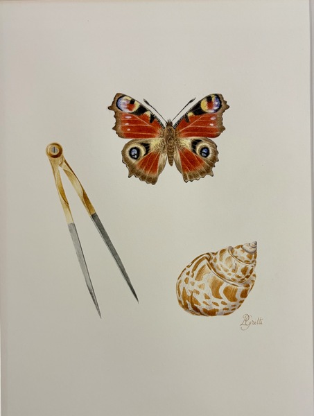cabinet de curiosités: coquillage, paon du jour et compas